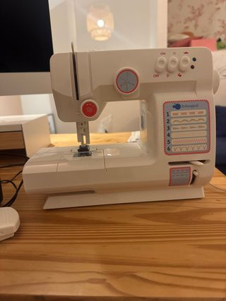 Máquina de coser de juguete, ideal para iniciarse en la costura. Lo que se ve en las fotos. Funciona. - Diseño compacto y ligero. - Color blanco con detalles en rosa. - Incluye adaptador de corriente.