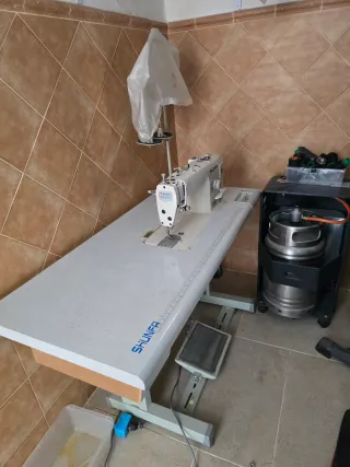 Máquina de coser industrial en buen estado. Es una máquina recta automática, ideal para trabajos de costura profesionales. Corte ,atraque,pespunte automático, se levanta la pata con rodillera. Se encuentra en Humanes de madrid . L