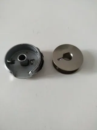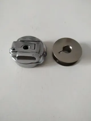 Set de canillero y bobina para máquina de coser Refrey. Piezas metálicas. - Canillero metálico. - Bobina metálica.