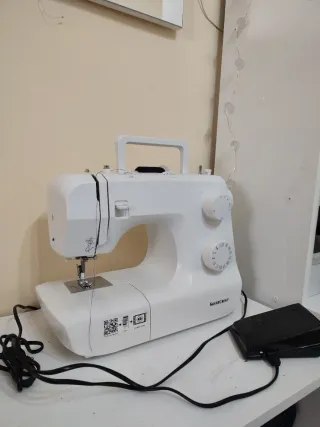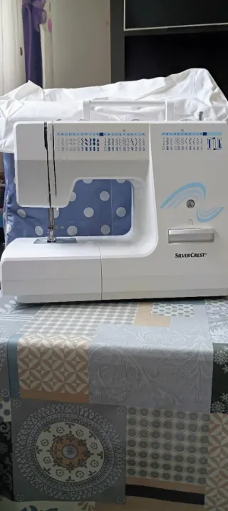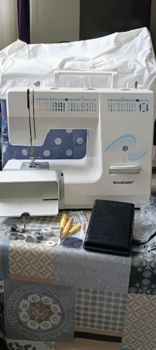 Máquina de coser SilverCrest SNM 33 A1. Brazo libre, 33 tipos de puntadas, luz de costura, incluye accesorios (prensatelas, canillas,...), pedal y manual de instrucciones. Me la regalaron hace unos años, solo la he utilizado para coser mascarillas durante la pandemia. Funciona pero imagino que tendrás que hacerla una puesta a punto después de tanto tiempo sin uso, no sé coser y eso se me escapa. No hago cambios y entrego en mano en zona ensanche de Vallecas. Lleva una funda de plástico blanca pero no conservo la caja