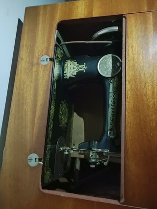 Máquina de coser Singer antigua de pedal, con número G8616911 fabricada en 1920 . Se encuentra en un estado de conservación excelente con todos los detalles dorados y placas en perfecto estado. Mueble de madera pulida muy cuidada.
