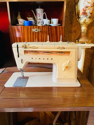 Máquina de coser SINGER de estilo vintage. - Diseño retro en color crema. - Solo se dispone de lo que aparece en la foto - Se desconoce si funciona. - Sirve para piezas o otros usos.
