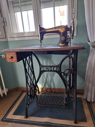 Antigua máquina de coser Singer a pedal. Por número de referencia es de 1921. Funciona a la perfección y está muy cuidada. Viene con mueble de madera original. Medidas 75 altos 40 ancho 75 alto.