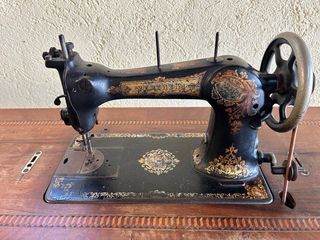 Preciosa máquina de coser Singer antigua, en excelentes condiciones estéticas. Ideal para decoración o coleccionistas. - Modelo clásico con detalles dorados. - Mecanismo de metal resistente. - Base de madera.