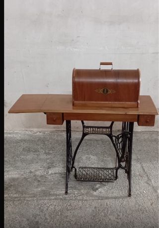 Máquina de coser Singer, con base de hierro fundido y mueble de madera. - Base de hierro fundido con detalles ornamentales. - Mueble de madera con cajones. - Cubierta de madera con el logo de Singer. Puede mirar sin compromiso.