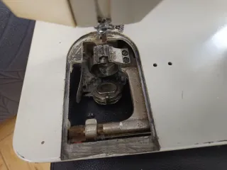 Pieza de máquina de coser antigua, ideal para coleccionistas o para quien busque un elemento decorativo con historia. - Mecanismo de bobina visible. - Estructura metálica.o para piezas