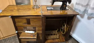 Preciosa máquina de coser antigua, un modelo clásico de la marca Singer. - Diseño vintage en negro y dorado. - Incluye su mueble de madera original con tapa. - Ideal para coleccionistas o decoración.