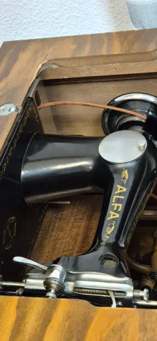 Máquina de coser antigua de la marca Alfa, con una base de madera y estructura metálica. - Diseño clásico. - Ideal para coleccionistas o decoración.