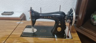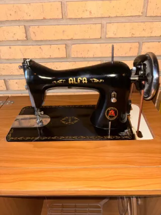 Máquina de coser Alfa de estilo antiguo, ideal para coleccionistas o decoración. - Diseño clásico en color negro. - Incluye su mesa de madera. - Pedal de pie para accionarla.