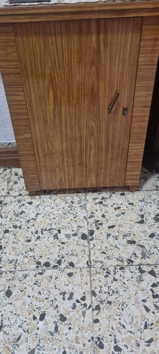 Se vende máquina de coser Singer antigua, guardada en un mueble moderno. - Mueble de madera con acabado brillante. - Tirador metálico en la puerta del mueble.