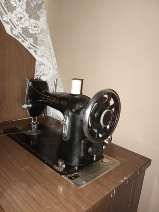Máquina de coser clásica de la marca Sigma, ideal para coleccionistas o para quienes aprecian los objetos vintage. - Diseño retro en color negro. - Detalles dorados de la marca. - Volante lateral para manejo manual.
