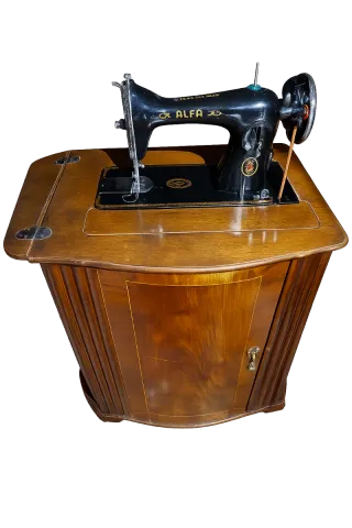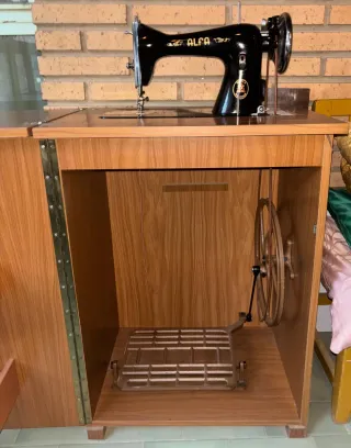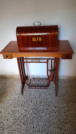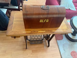 Máquina de coser antigua de la marca ALFA. Un mueble clásico que añade un toque vintage a cualquier espacio. - Estructura de madera. - Detalles metálicos.