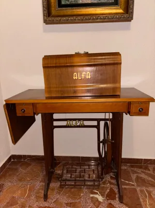 Preciosa máquina de coser Alfa, de madera y metal. Se encuentra en buen estado de conservación, ideal para coleccionistas o amantes de las antigüedades. - Incluye la máquina y su mueble de madera. - El mueble presenta un diseño elegante con incrustaciones de madera. - La tapa de madera de la máquina tiene el nombre Alfa grabado.