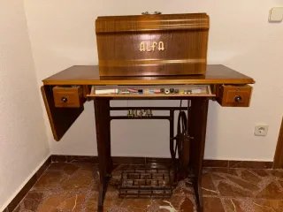 Máquina de coser antigua de la marca Alfa con mesa incluida. Un clásico para coleccionistas o para quienes aprecian el diseño retro. - Diseño vintage. - Mecanismo de pedal.