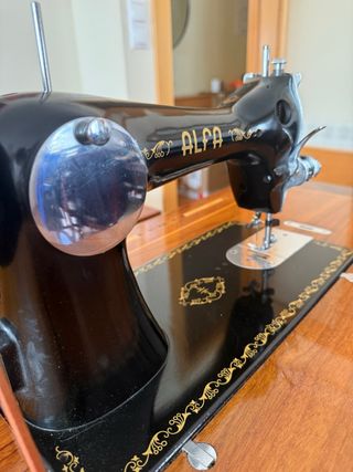 Máquina de coser clásica de la marca Alfa, con un diseño elegante y detalles dorados. - Cuerpo principal en acabado negro brillante. - Detalles decorativos en dorado. - Base de madera pulida. - Mueble original - Funcional