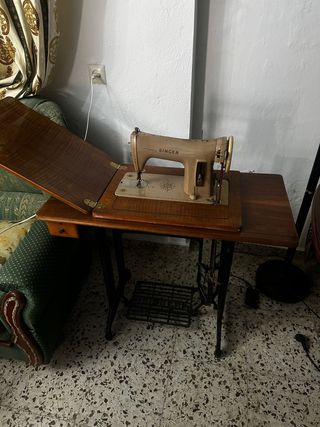 Máquina de coser Singer clásica, con su mueble de madera integrado. Ideal para coleccionistas o para quienes disfrutan de la costura tradicional. - Mueble de madera con cajones y compartimento. - Máquina de coser Singer de metal. - Funciona. - Se escuchan ofertas.