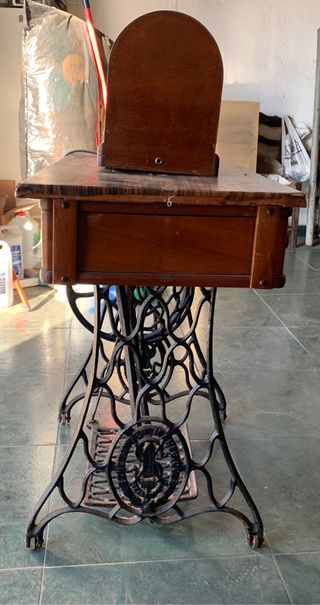 Preciosa máquina de coser antigua de la marca Singer. Ideal para decoración o coleccionistas. - Máquina de hierro fundido, con estructura robusta y detallada. - Diseño clásico y elegante. - Superficie de madera en la mesa. - Funciona sin problemas.