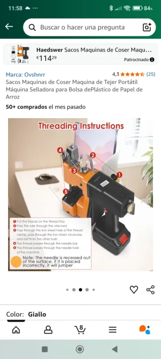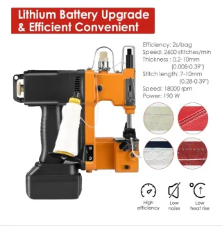 Máquina de coser portátil, ideal para cerrar sacos de forma rápida y eficiente. Funciona con batería de litio. - Alta eficiencia: 2 segundos por saco. - Velocidad de costura: 2600 puntadas/min. - Grosor de material: 0.2-10mm. - Longitud de puntada: 7-10mm. - Velocidad del motor: 18000 rpm. - Potencia: 190 W. - Bajo nivel de ruido. - Bajo aumento de calor. - LA MAQUINA VA SIN BATERIA NI CARGADOR