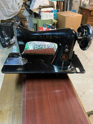 Máquina de coser clásica de la marca ALFA, un modelo antiguo con un diseño distintivo. - Cuerpo de metal negro brillante. - Detalles decorativos dorados. - Base de madera oscura.