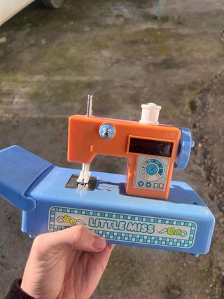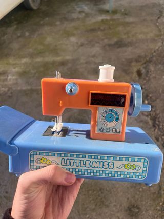 Juguete antiguo de máquina de coser de la marca Little Miss. Un clásico para coleccionistas o para revivir la nostalgia. - Totalmente funcional - Diseño vintage en color naranja y azul. - Incluye la base y la máquina. - Detalle de Little Miss en la base.