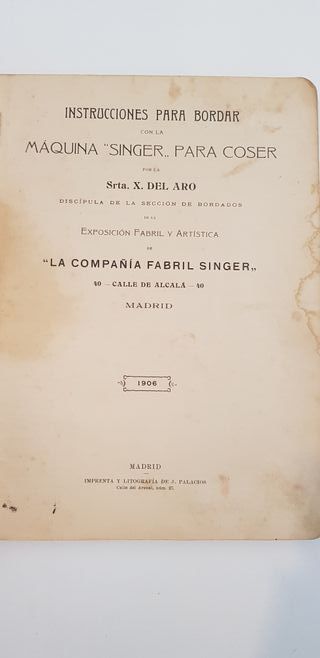 Instrucciones para bordar con la máquina Singer para coser Incluye lugar y año de publicación: Madrid 1906. 137 páginas + índice, manual ilustrado. Ejemplar en buen estado general: algunas manchitas que sólo afectan a las primeras hojas, luego desaparecen y páginas completas. Con fotografías