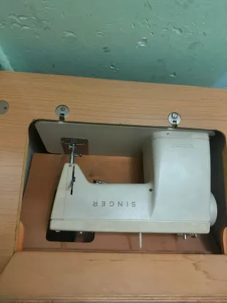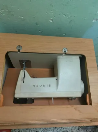 Máquina de coser Singer clásica, ideal para tus proyectos de costura. Incluye su mueble original. - Diseño elegante en tonos beige y marrón. - Fabricada con materiales duraderos como plástico y madera.