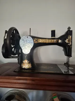 Máquina de coser Singer clásica, con un diseño vintage y elegante. - Cuerpo principal en metal negro con detalles dorados. - Base y mueble de madera. - Incluye la tela de muestra cosida.