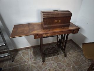 Máquina de coser antigua de la marca ALFA. Un mueble clásico con un diseño que aporta un toque vintage. - Incluye su tapa de madera. - Base metálica con pedal.