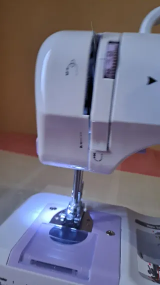 Máquina de coser en color blanco y morado. - Diseño compacto. - Luz LED integrada.