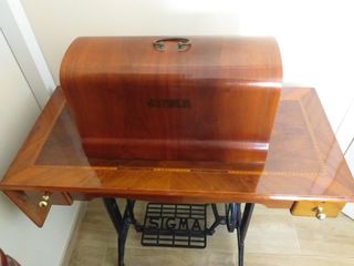 Preciosa máquina de coser Sigma antigua, en perfecto estado de conservación. Se incluye la máquina y su mueble de madera. - Máquina de coser Sigma. - Mueble de madera con incrustaciones. - Tapa de madera a juego.
