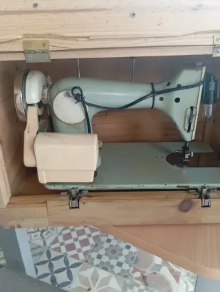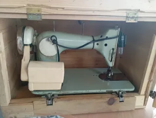 Máquina de coser vintage, un clásico para tu hogar o taller. Se encuentra guardada en su caja original de madera. - Diseño retro en tonos verde y beige. - Construcción robusta con detalles metálicos y plásticos. - Incluye su caja de madera para almacenamiento y protección.