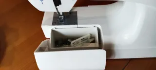Máquina de coser de la marca Lervia en color blanco. - Diseño compacto y moderno. - Panel de control con selección de puntadas. - Brazo libre para costuras tubulares. Puesta a punto hecha recientemente.