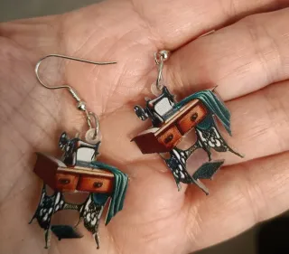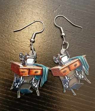Pendientes con un diseño detallado de una máquina de coser antigua. - Acabado en tonos marrones y turquesa. - Diseño vintage. - Cierre de anzuelo. Sólo envío.