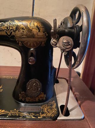 Detalle de máquina de coser antigua con un diseño elegante. - Volante metálico con detalles dorados. - Cuerpo principal en color negro con ornamentación. - Piezas de plástico y metal. Funciona 100%