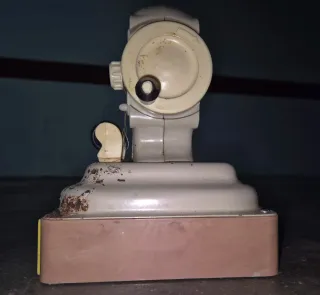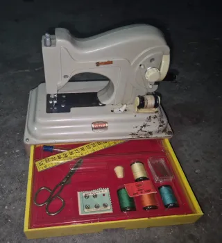 Máquina de coser de estilo retro, con un diseño clásico que evoca épocas pasadas. Su base es de color amarillo y la estructura principal es de un tono crema. - Diseño vintage. - Base amarilla. - Estructura en crema. Funcionaba a pilas pero no puedo asegurar que funcione actualmente.
