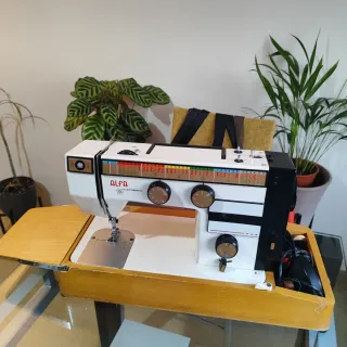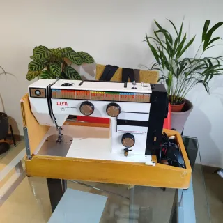 Máquina de coser Alfa Electronic en su base de madera y maletín para mejor transporte y guardarla. El potenciador de velocidad no funciona, siempre va a la misma velocidad, por lo demás cose perfecto.