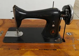 Máquina de coser antigua Alfa, un clásico para coleccionistas o amantes de la costura tradicional. - Estructura principal de metal. - Base y detalles en madera. - Diseño vintage. - Totalmente funcional
