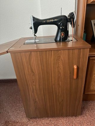 Máquina de coser antigua de la marca Alfa, con un diseño clásico.Funciona a pedal.No lleva motor.Va metida en un mueble y se saca cuando se vaya a utilizar - Estructura principal en metal. - Base y detalles en madera.