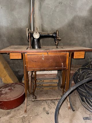 Preciosa máquina de coser antigua de la marca Singer, con su mueble de madera y pedal. - Diseño clásico y elegante. - Mueble de madera con cajón. - Base de pedal metálica.