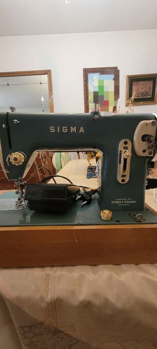 Máquina de coser antigua de la marca SIGMA, en buen estado. - Diseño clásico. - Incluye su tapa protectora de madera. - Base de hierro fundido con pedal.