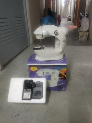 Mini máquina de coser eléctrica, compacta y fácil de usar. Ideal para pequeños arreglos y proyectos de costura. - Incluye adaptador de corriente y pedal. - Diseño blanco moderno.