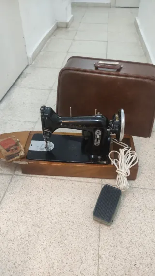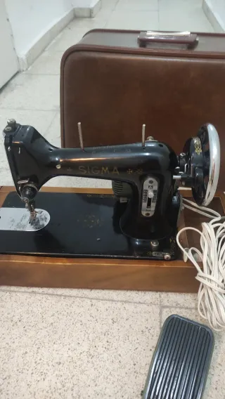 Máquina de coser antigua Sigma, en color negro, con su base de madera y maletín de transporte. - Incluye pedal con motor - Cable de alimentación. - Aplique de luz - Manual de uso
