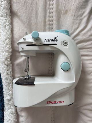 Máquina de coser compacta de la marca Nahfee. - Color blanco y detalles en azul. - Diseño moderno y fácil de usar.