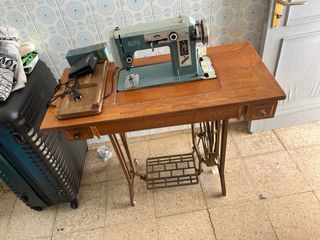 Maquina de coser Alfa mas su mueble en madera. Tambien se incluye caja original con accesorios. La maquina funciona a motor electrico o a pedal. Se incluyen correas y accesorios. El precio es negociable.