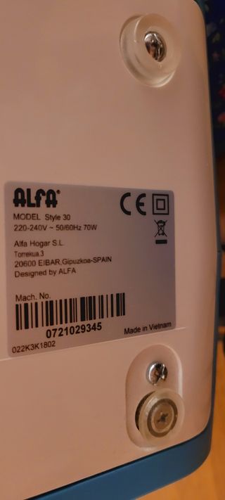 Máquina de coser Alfa Electronic en color blanco y negro. Incluye pedal. - Diseño compacto. - Panel de control con diales y selector de puntadas. Venta en persona.
