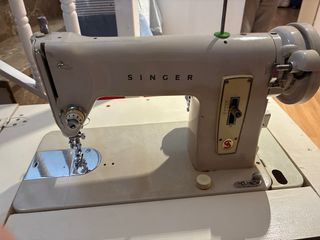 Máquina de coser Singer de estilo vintage, ideal para coleccionistas o para quienes aprecian la calidad de las máquinas antiguas. Esta como nueva, equipada con luces y ruedas. - Diseño clásico en color gris. - Marca Singer reconocida por su durabilidad.