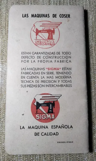Catálogo de piezas para máquinas de coser de la marca SIGMA, fabricadas por ESTARTA Y ECENARRO, S.A. en Elgoibar. 48 páginas de 9x16 centímetros. - Catálogo de piezas. - Máquinas de coser SIGMA. - Fabricante: ESTARTA Y ECENARRO, S.A. - Ubicación: Elgoibar. Envío por Wallapop Correos (si puede ser). Ver fotos ya que forman parte de la descripción. Precio del lote 20€. E.L.C.