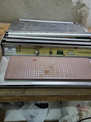 Máquina para envolver cosas . Bocadillos verduras ect .rollos de plástico. - Etiqueta HAND WRAPPER. - Etiqueta AUTO HEATER parcialmente visible.