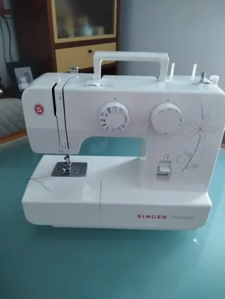 Máquina de coser Singer Promise en color blanco. - Diseño compacto y moderno. - Asa para facilitar su transporte. - Incluye accesorios básicos para empezar a coser. -Incluye: Pedal, prensatelas universal, para cremallera, ojales, botones, destornillador plano, brocha/ descosedor, guía para coser bordes/edredones, canillas, plancha para zurcidos y cubierta para taparla. - Se entrega en su caja original. - Se ha usado dos veces, está nueva.