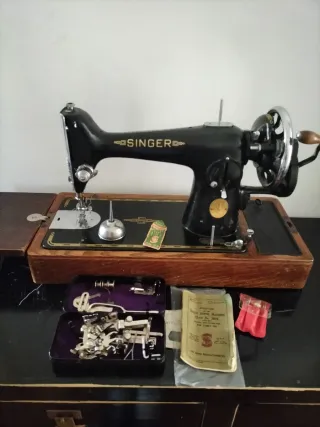 Preciosa maquina de coser Singer vintage, fabricada en 1938. En excelentes condiciones. Con su cajón de madera original, caja de lata con variedad de accesorios, botella de aceite de lata también original. Puesta al día, cose si se trata con cariño.